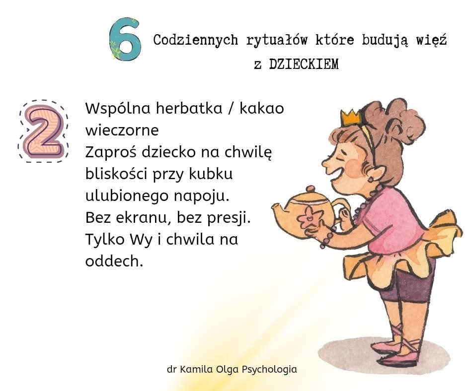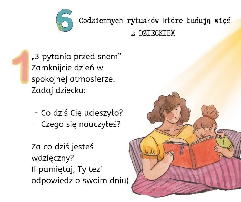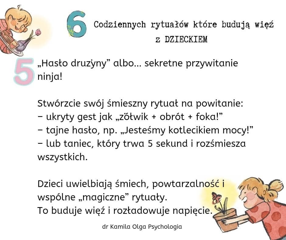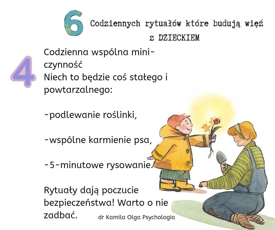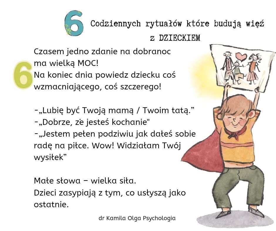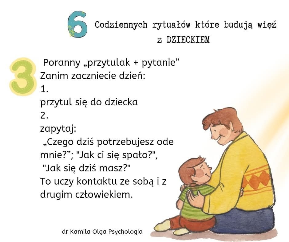 Zachęcamy Państwa do zapoznania się z przygotowaną da państwa tablicą informacyjną w przedszkolnym hallu oraz z propozycją 6 prostych rytuałów, które mogą pogłębić Państwa więź z dzieckiem, tworząc tym samym silny fundament dla jego zdrowego rozwoju emocjonalnego