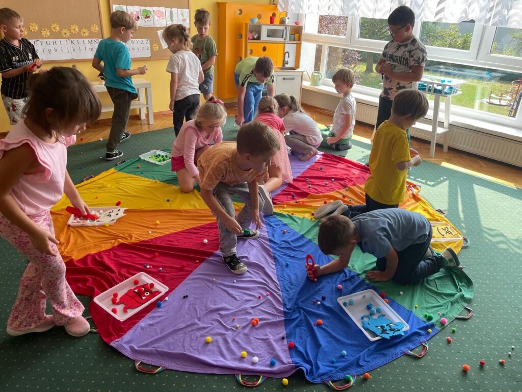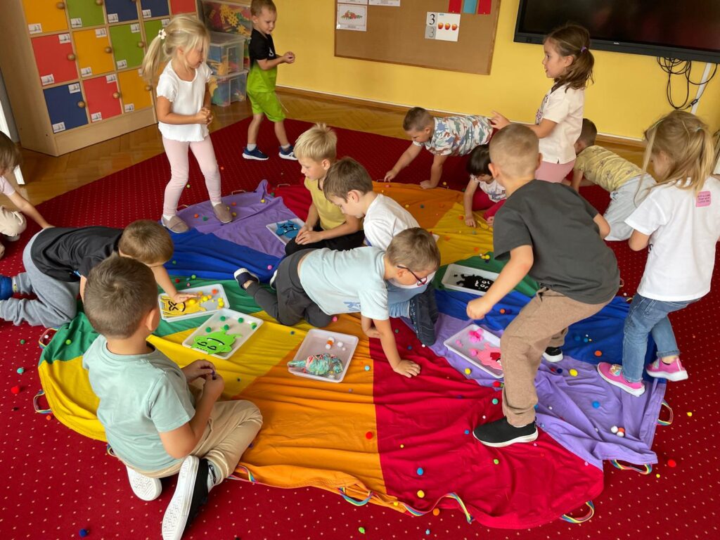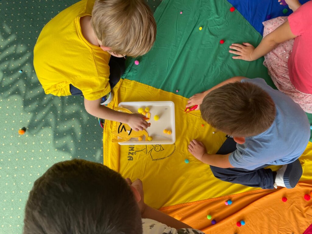 Dzieci z autyzmem często mają trudność ze wspólną zabawą z innymi. Spróbujcie pobawić się teraz razem chustą animacyjną, dbając o to, aby każdy był włączony w zabawę, a także współpracując ze sobą.